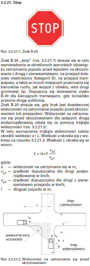 Znak B-20 "stop" stosuje się w celu wprowadzenia w określonych warunkach obowiązku zatrzymania pojazdu przed wjazdem na skrzyżowanie z drogą z pierwszeństwem (...), a także w innych miejscach przecinania się kierunków ruchu, jak wyjazd z obiektu, wlot drogi gruntowej itp. (...)
